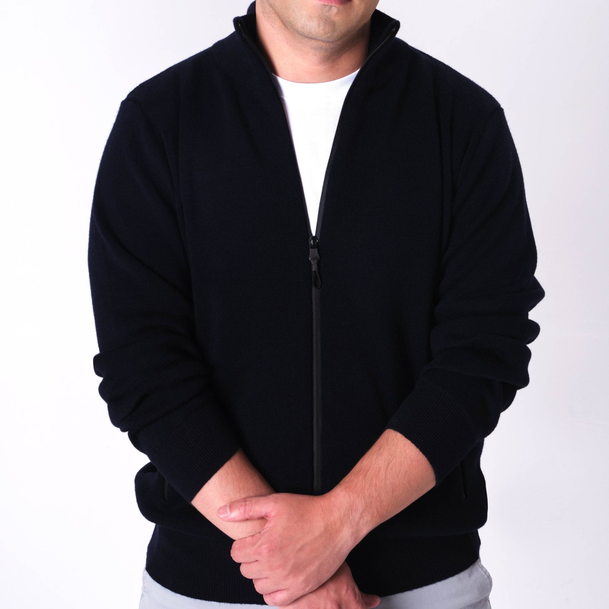 Erkek Lacivert Hırka, Premium Organik %70 Yün, Yüksek Yaka ve Fermuarlı, Sıcak Tutan Yumuşak Dokulu Kazak